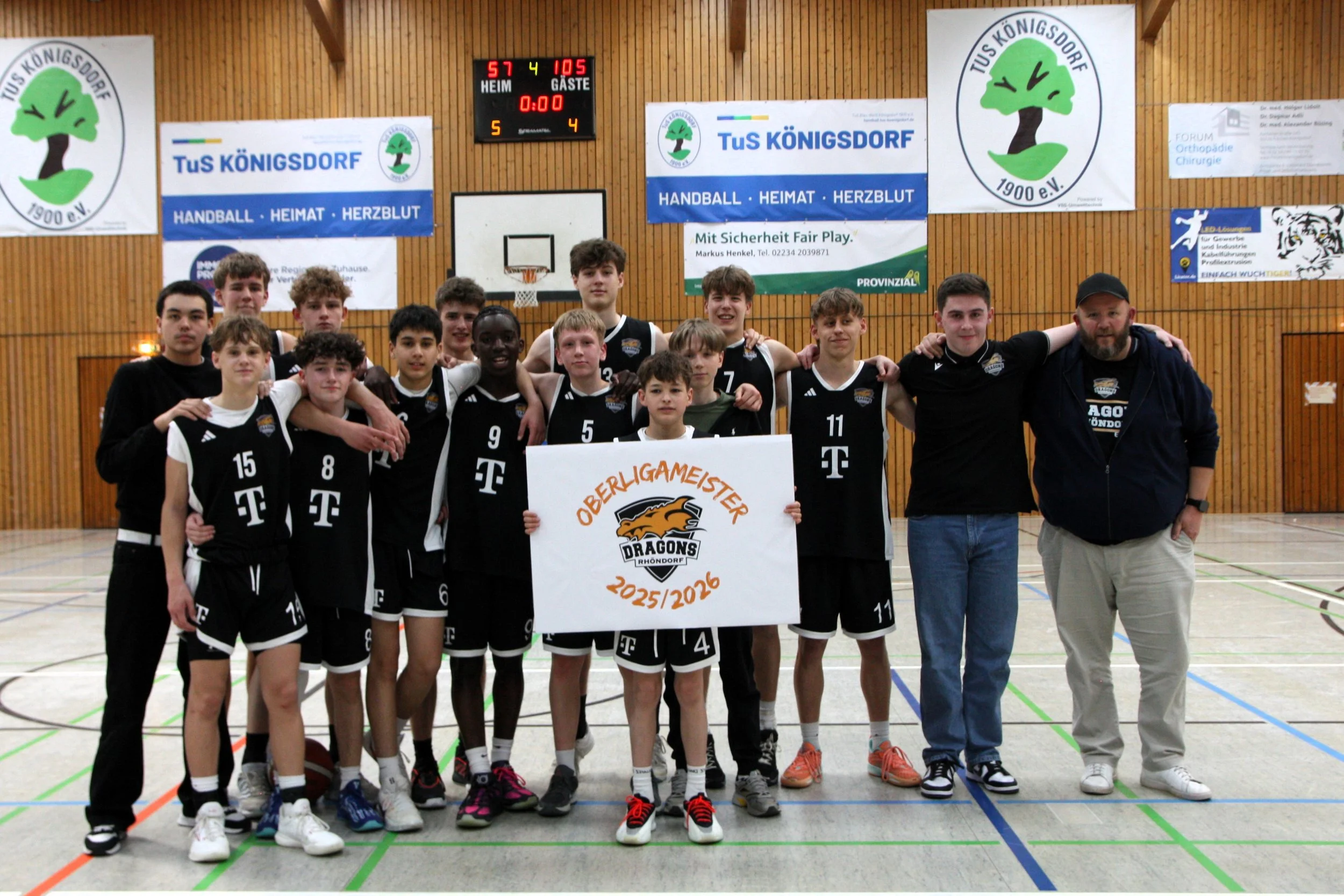Auch im Schlussabschnitt waren es die Rhöndorfer, die besser starteten. Nach lediglich 30 Sekunden standen nach einem Floater, einem defensiven Stopp und einem Dreier fünf weitere Punkte auf der Habenseite und der Vorsprung wuchs auf 39 Zähler (31”/40:79). Anschließend konterte Königsdorf mit fünf Punkten in Folge (32”/45:79). Doch danach folgte über mehrere Minuten hinweg erneut pure Dominanz der Gäste: Zahlreiche Stopps in der Defensive führten immer wieder zu leichten und sehr schön herausgespielten Punkten. Die U16.1-Jungs starteten erneut einen bemerkenswerten 21:5-Lauf, verbuchten allein im vierten Viertel starke zehn Assists und durchbrachen bereits mehr als vier Minuten vor Spielende die 100-Punkte-Marke (36”/50:100). Am Ende stand für den Dragons-Nachwuchs ein auch in dieser Höhe absolut verdienter 105:57-Auswärtssieg sowie die vorzeitig gesicherte Oberliga-Meisterschaft (40”/57:105).